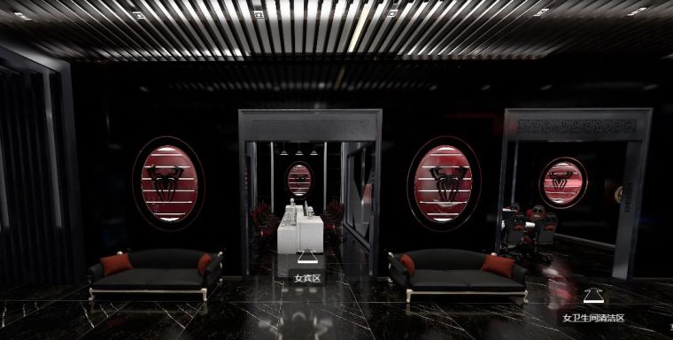 在迎賓區(qū)兩邊,左右分布著男賓區(qū)和女賓區(qū)。相較于普通網(wǎng)咖設(shè)計(jì),電競會(huì)館具有賽事承辦上的專業(yè)特色,為了使人更加有比賽所需專注,男賓區(qū)墻面只有簡單的涂鴉,飾物元素也極少,相較于男賓區(qū)設(shè)計(jì)較為簡單,女賓區(qū)“紅蜘蛛”主題感十足,頂墻燈光合理搭配來減少黑色來的的壓抑感。男女獨(dú)立衛(wèi)生間分別分布在兩個(gè)區(qū)域,非常人性化。