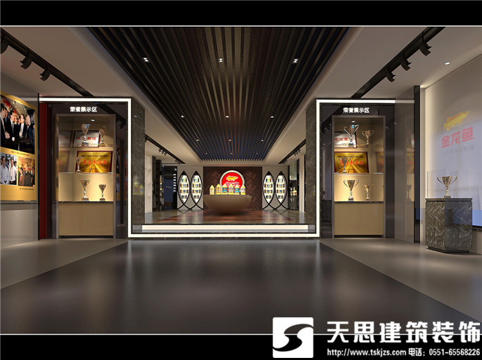 展廳是提高產(chǎn)品和企業(yè)品牌形象的場(chǎng)所,表達(dá)個(gè)性風(fēng)格是這個(gè)空間的關(guān)鍵。金龍魚通過(guò)利用地面折線分割跑道的表現(xiàn)與背景形象的鮮明顏色相互配合產(chǎn)生強(qiáng)烈視覺(jué)沖擊效果,令人耳目一新,印象深刻。在其中部設(shè)計(jì)中,運(yùn)用厚重的體量感,如半圓形及魚形,將所有的空間有機(jī)地聯(lián)系起來(lái),長(zhǎng)久、富貴、不可侵犯。