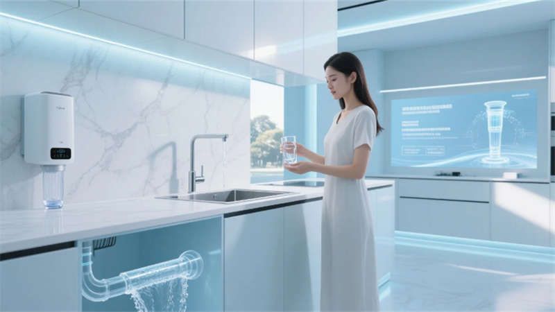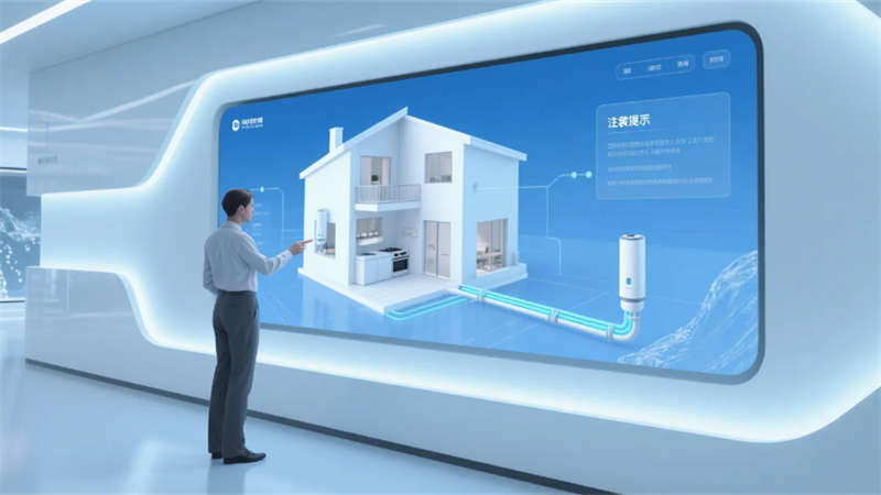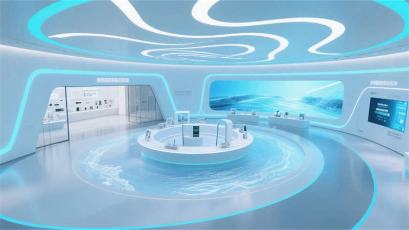 展廳以環(huán)形動線串聯(lián)六大核心模塊:入口10米寬LED水幕墻動態(tài)演繹凈水原理;中央懸浮式產(chǎn)品矩陣展臺,通過全息投影拆解RO膜過濾技術(shù);實景化場景區(qū)1:1復刻家庭廚房、商務(wù)辦公樓及工業(yè)廠房,搭配交互式水質(zhì)監(jiān)測實驗臺;獨創(chuàng)的“虛擬管家”AR系統(tǒng),可生成個性化凈水方案并投射至合肥典型戶型模型。空間頂部采用參數(shù)化設(shè)計的波浪形燈網(wǎng),象征長江與淮河水系交匯,地面嵌入城市節(jié)水數(shù)據(jù)可視化地磚,凸顯本土環(huán)保責任感。