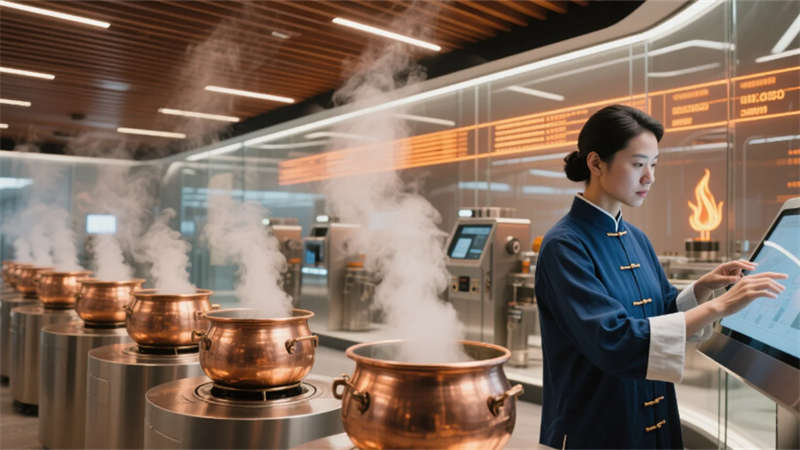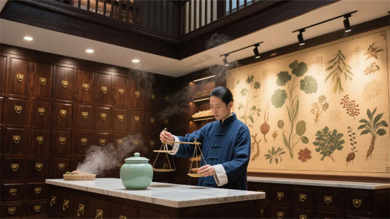 露天庭院白石鋪就太極紋路,素衣身影在紫竹霧靄間起勢推掌,漏窗剪出晨練動態(tài)。名醫(yī)診室紅木案上脈枕微溫,博古架藥材標(biāo)本與滿墻醫(yī)典沉淀千年智慧。智慧煎藥中心的銅鍋陣列于胡桃木頂下吞吐蒸汽,光影交織傳統(tǒng)與現(xiàn)代。